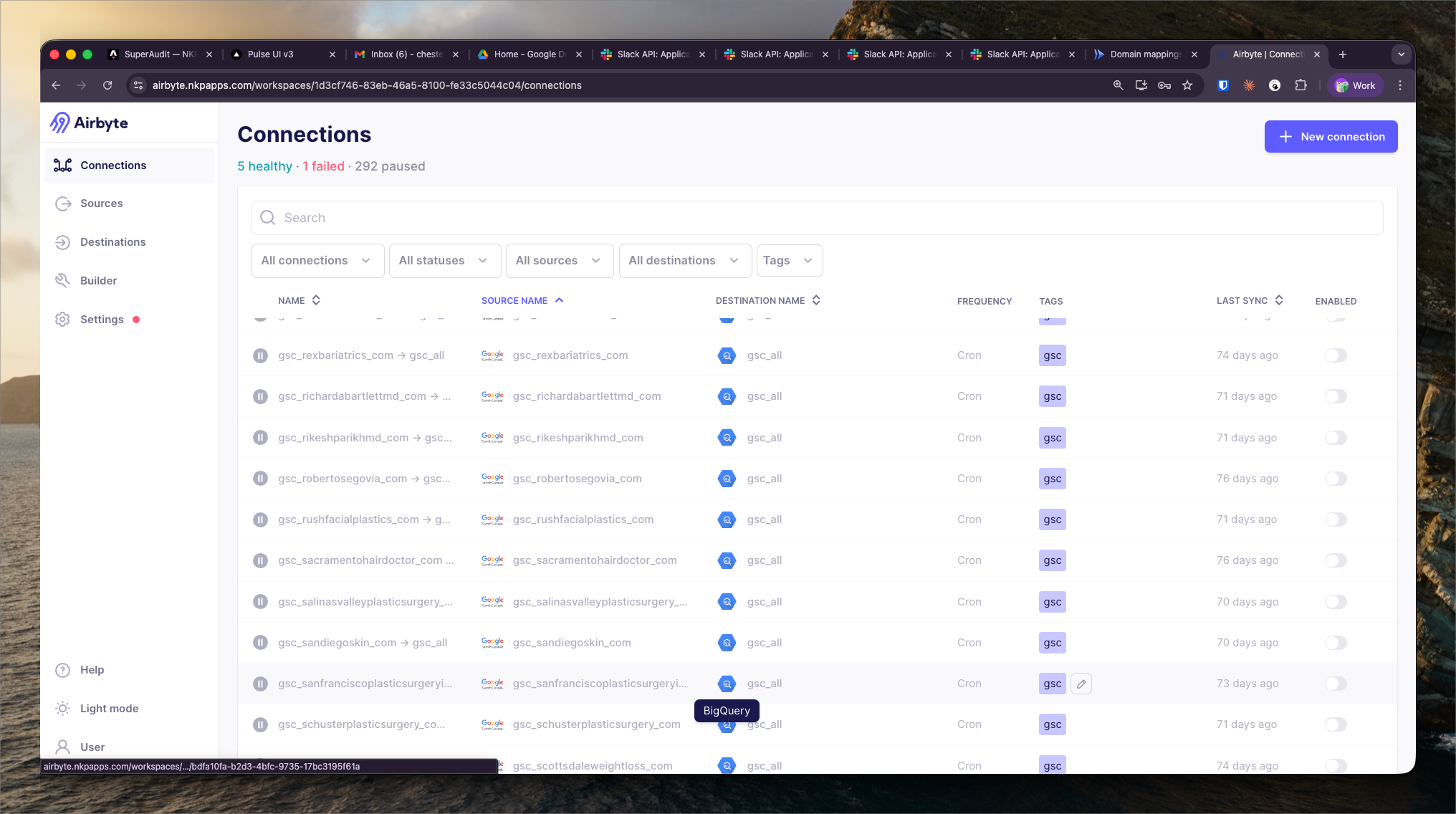 Account Connections provides a per-account view of sync health across all Airbyte connections. Where the Pipeline Overview is organized by connection, this view is organized by NKP client account — showing all data pipelines relevant to a single account in one place.