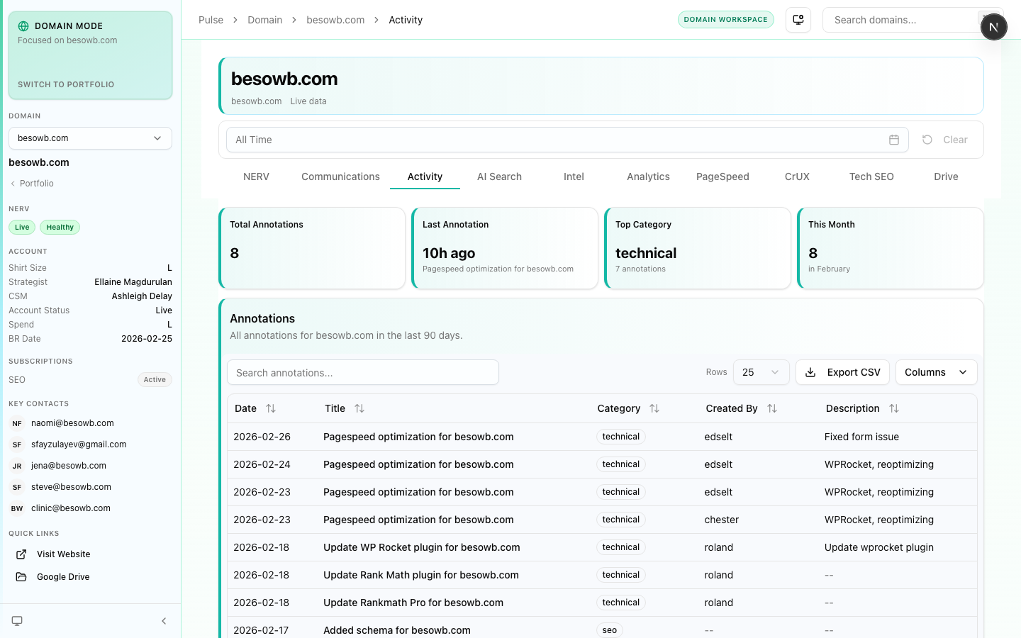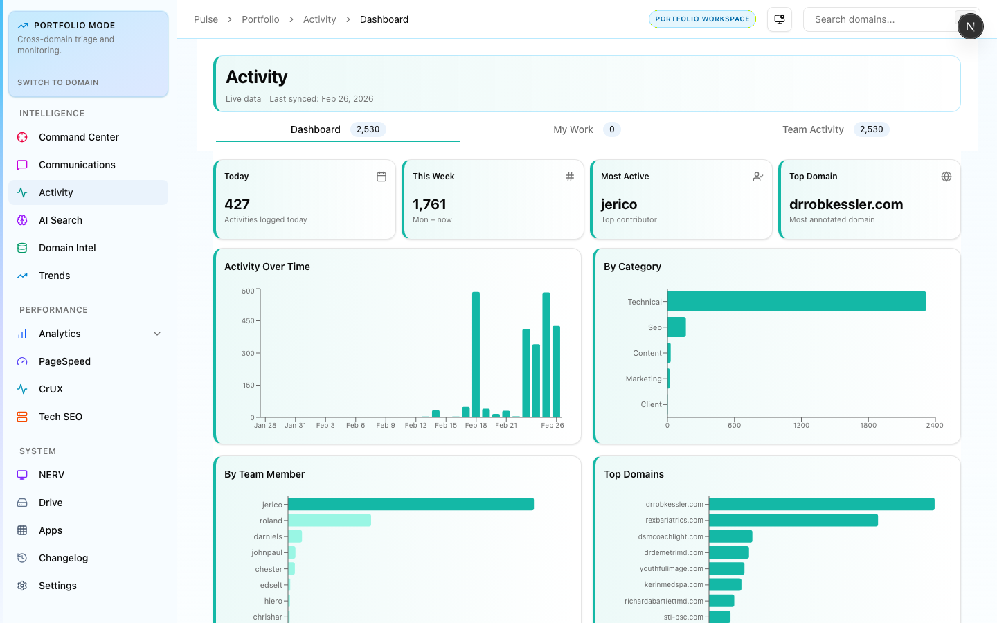 500 activities logged with breakdown by category (Technical, Marketing, Content), team member contribution, and top active domains — full team visibility in one view.