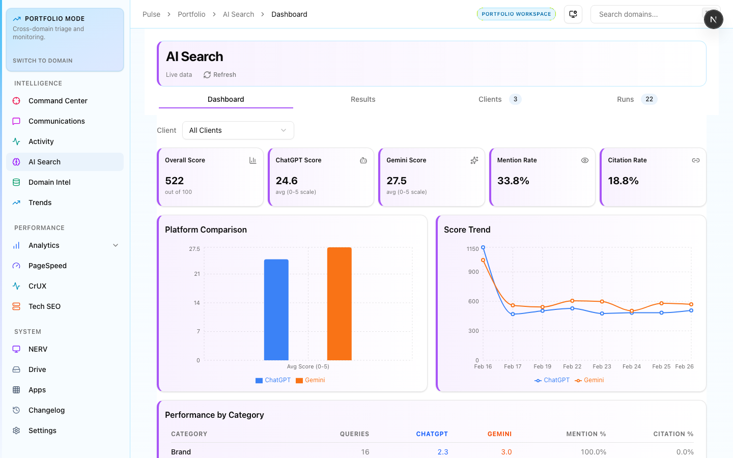 Brand presence tracking across ChatGPT and Gemini — per-client visibility scores, query results, and trend history for NKP portfolio accounts.