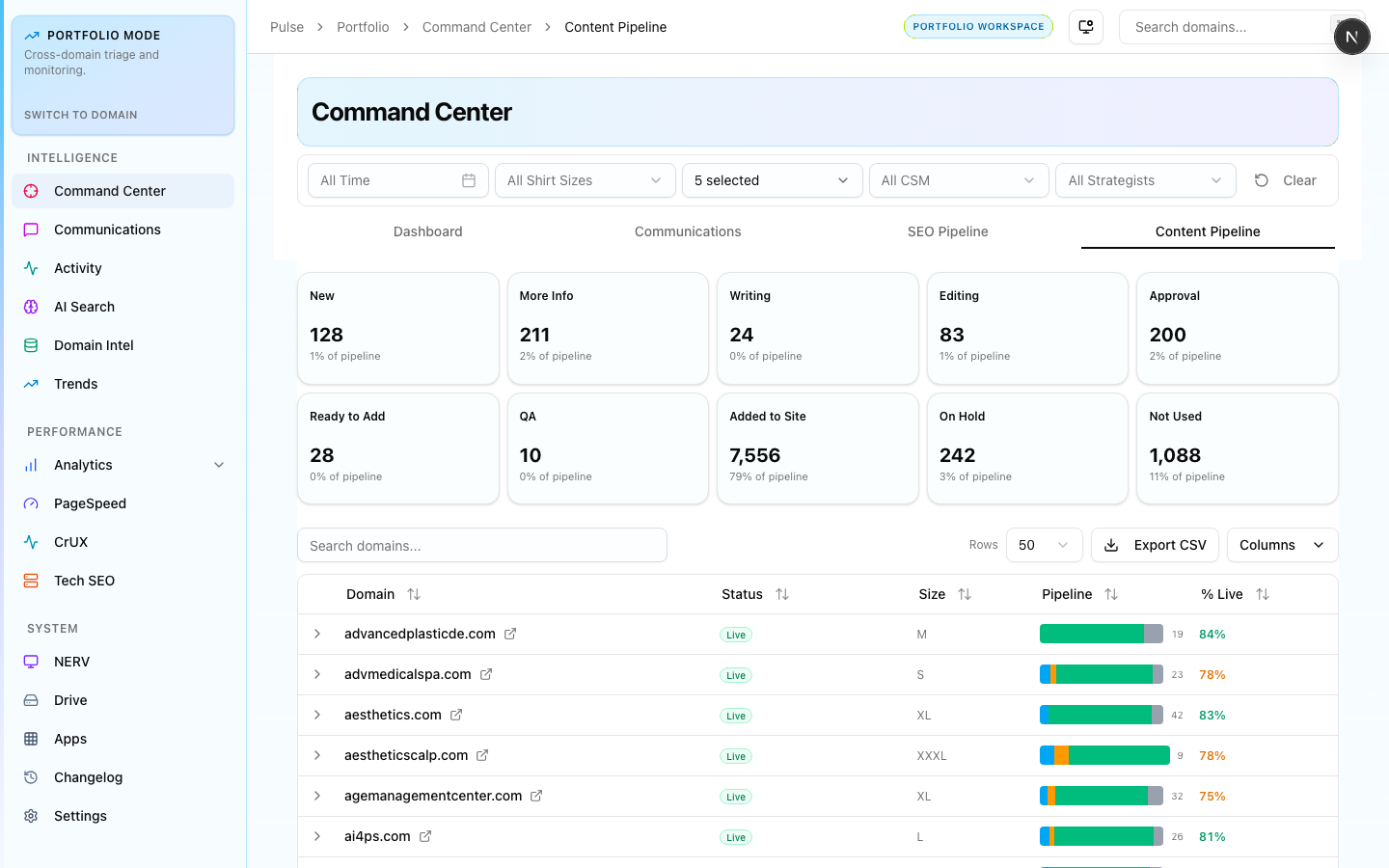 Content workflow stage tracking — 128 new, 211 needing more info, with per-domain pipeline percentage and stage breakdown (writing, editing, approval, QA).