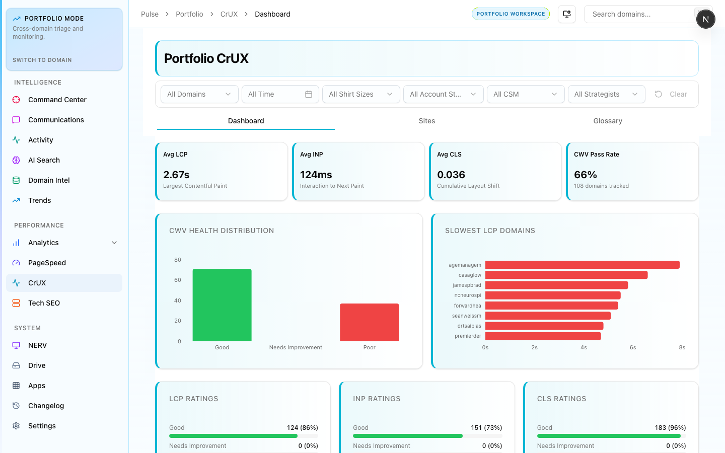 Real-user field data: 2.67s avg LCP, 124ms INP, 0.096 CLS. 66% of portfolio domains passing Core Web Vitals. CWV health distribution and slowest LCP domain rankings.