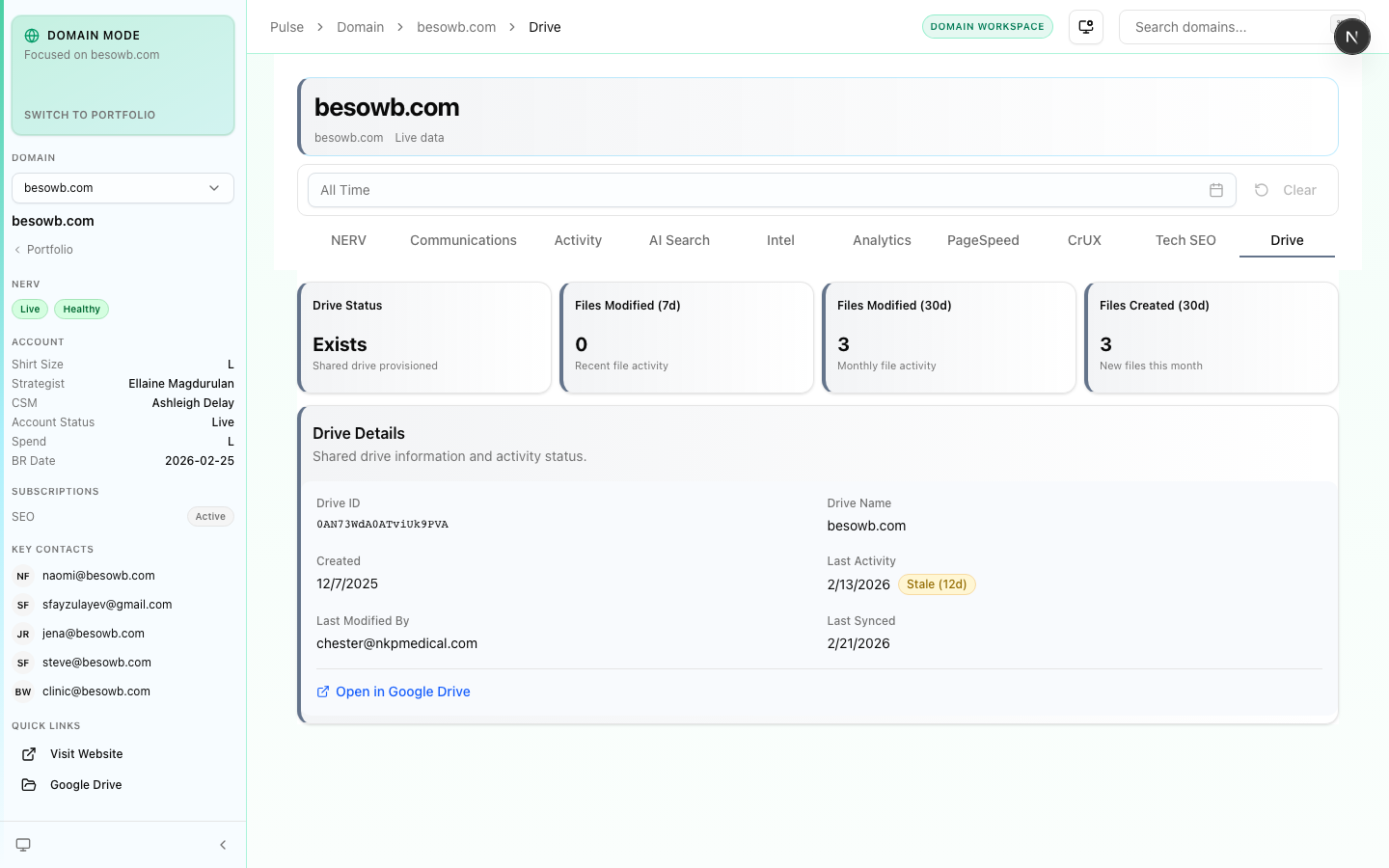 Portfolio-level Google Drive overview — all client shared folders, sharing status, and storage usage across accounts.