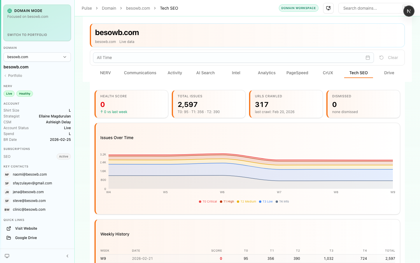 717K+ Screaming Frog issues across 228 domains — tiered by severity (critical, warning, notice) with week-over-week delta per domain.