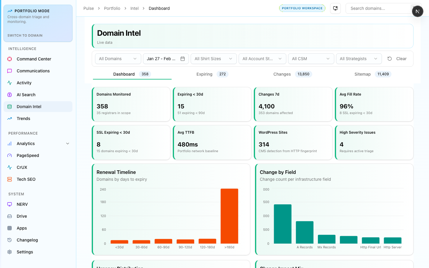 Portfolio-wide infrastructure monitoring — DNS, RDAP, SSL, and HTTP field-level changes flagged across all tracked domains.