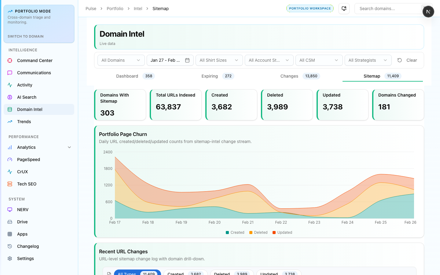 Portfolio URL change tracking — crawled, deleted, and updated pages with page churn distribution across all accounts.