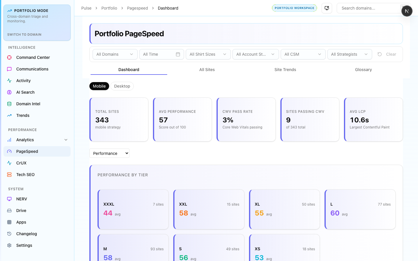 Lighthouse score distribution across the full portfolio — average mobile/desktop scores, worst performers, and week-over-week improvement tracking.