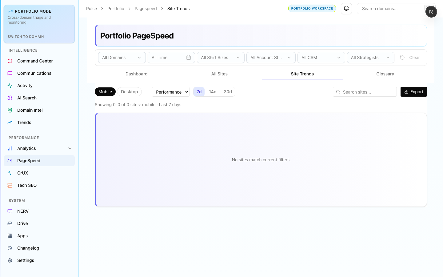 Portfolio-wide Lighthouse score distribution — average mobile and desktop performance scores with worst-performing domain rankings.