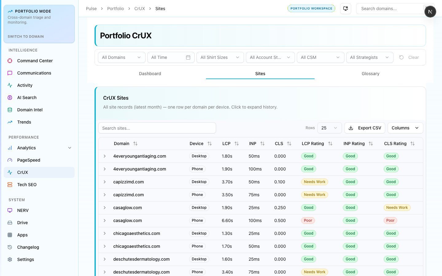 Per-site breakdown with individual LCP, INP, and CLS scores and pass/fail status. Sort by any metric to find the worst performers. Use this to prioritize PageSpeed remediation work by domain.
